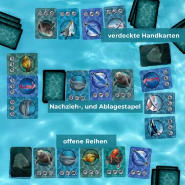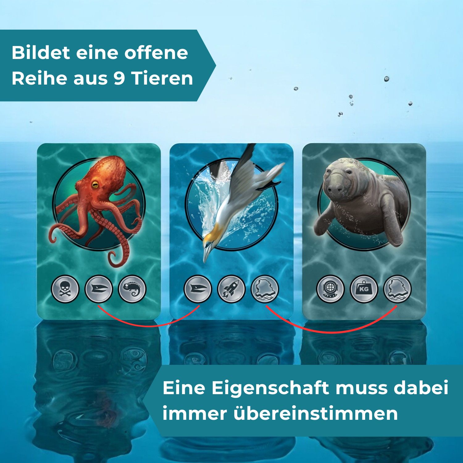 • DEIN SPIEL: Entdecke das spannende Gesellschaftsspiel "Meeresrauschen – Kartenwirbel unter Wasser". Leg eine offene Reihe von 9 Tierkarten und gewinn das Spiel!