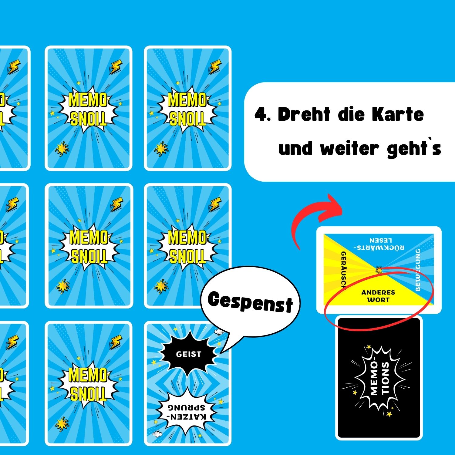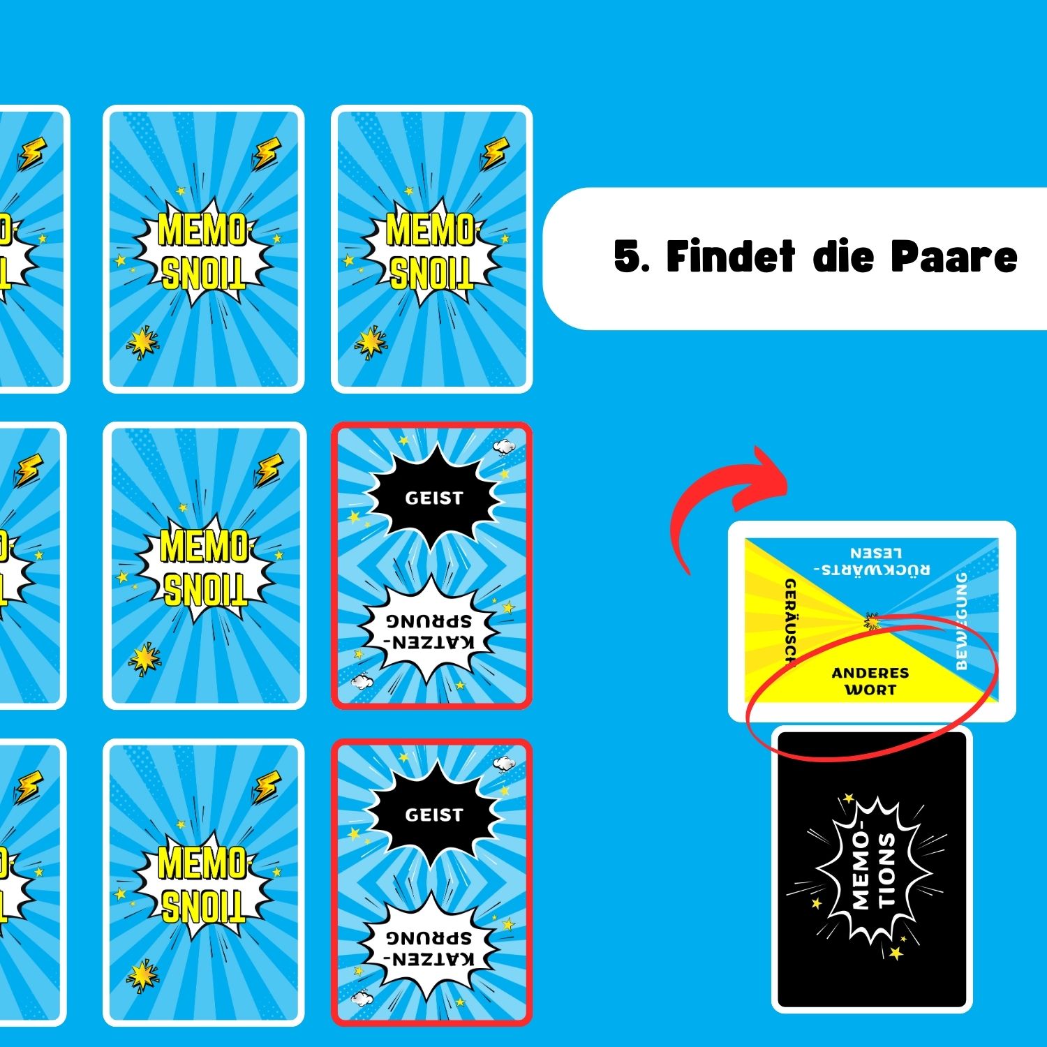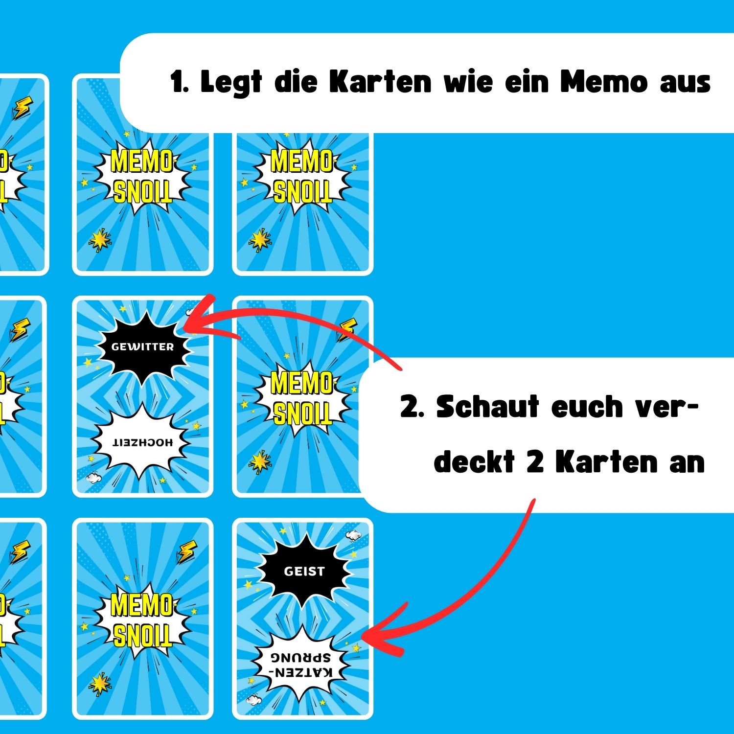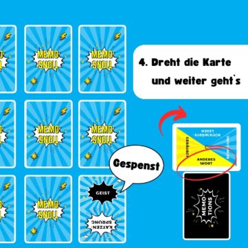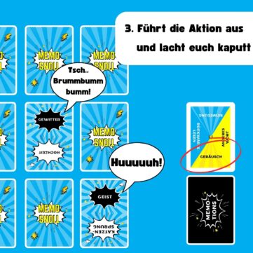 Ein Memo ohne Bilder? Klar, denn hier sind Bewegungen, Geräusche, Wörter und essintnnekeselsträwkcüR gefragt. Findet die Paare im Team und lacht euch kaputt! Einfache Regeln: Werft einen geheimen Blick unter die Karten und führt die Aktionen aus. Findet im Team die Kartenpaare. Welches Geräusch passt zu welcher Bewegung, zu welchem Wort und wie hört sich die Karte rückwärts an?